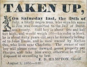This ad states that a slave, Jim, will be disposed of according to law if his owner does not come forward with proof of ownership. If not, perhaps Jim would have been made available for purchase, perhaps through public auction.